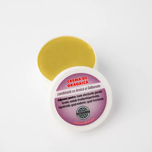Descoperă beneficiile Cremei de Drăgaică, Arnică și Gălbenele pentru sănătatea glandei tale tiroidiene. Această cremă special creată combină proprietățile valoroase ale drăgaicii, arnicăi și gălbenelelor, pentru a fi un adjuvant în tratarea afecțiunilor glandei tiroide.