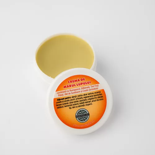 Descoperă secretul frumuseții și îngrijirii pielii cu Cremă de Mărul Lupului combinată cu Rostopască, Gălbenele, Trei Frați Pătați, Ulei de Sunătoare și Coada Șoricelului. Această cremă 100% naturală, îmbogățită cu ceară de albine și untură, este un veritabil adjuvant pentru o varietate de afecțiuni ale pielii. De la alergii, varice și ulcer varicos până la eczeme umede și uscate, prurit și psoriazis, această cremă deosebită poate să te ajute să îți menții pielea sănătoasă și frumoasă.